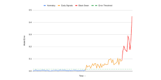 In this example, we can see three periods - in the Normalcy period, the model is not generating any significant error, meaning that it is correctly describing a period that is considered normal. In the Early Signals period, we notice that the model's errors are starting to increase quite significantly, indicating that firstly, our model doesn't recognize the properties our data is taking anymore, and secondly, that our prior belief (the situation is "normal") is likely to be false. Indeed - our final period indicates that a Black Swan event is happening: our model is totally lost and starts generating very large errors. Fundamentally, our model's error is describing whether the improbable (e.g. a Pandemic Flu) is happening.